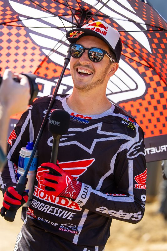 After posting a calculated fourth-place result at last week’s season-opening AMA Supercross, Honda HRC Progressive rider Hunter Lawrence was more aggressive at San Diego’s round 2. The Australian led much of the 450SX main event before taking a close second-place finish, showing that he has the pace to match anyone, particularly in the late stages. Lawrence’s teammate Chance Hymas showed strong form at times during the day, but a close call in the 250SX West main event meant he ultimately had to settle for sixth.