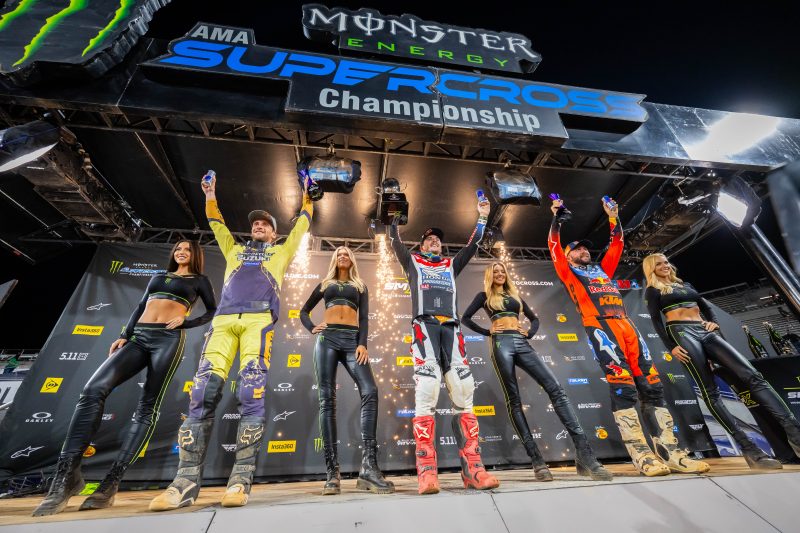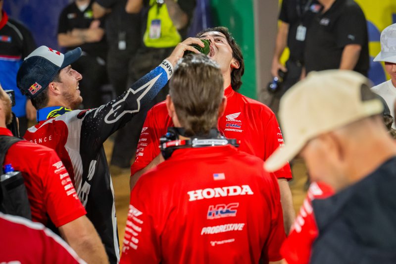 “The track layout was rather simple, but the conditions made it tricky, and we did a lot of laps. Kenny [Roczen] had a really good pace; when he got around Eli [Tomac], he put in some good laps, and I’mlike, ‘Alright, this is his really good sprint speed, so I need to kind of push at the beginning.’ I was trying to push as much as I could. That’s one of the things I find the coolest: a high-pressure moment or high-stakes scenario, and you’re able to deliver. You’ve got to be consistent, precise and just push the whole main. I don’t really want to think about the title, because it’s still seven races away and so much racing left to be had. I’m just trying not to be an idiot, and focusing on the week-in and week-out.”