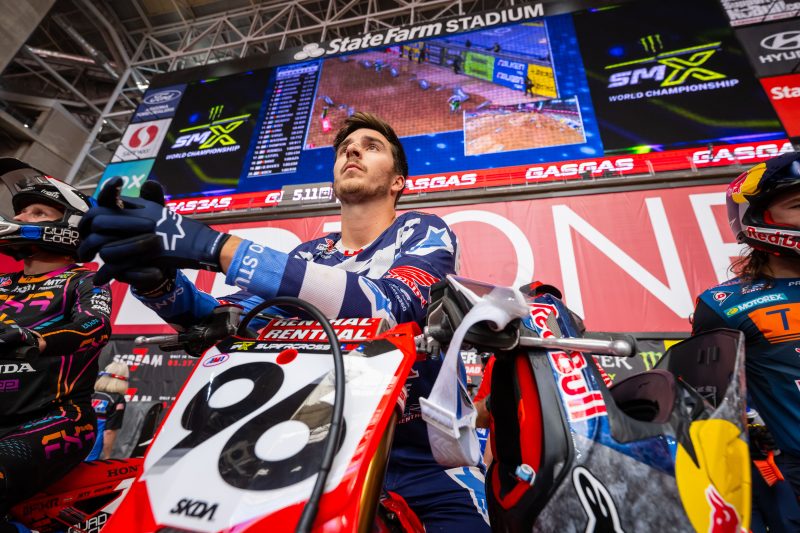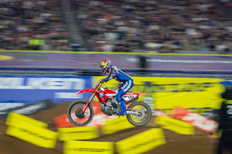 The 450SX main event saw the Honda HRC Progressive rider launch from the gate in third, but he wasted no time charging forward, taking over the lead on the opening lap. Lawrence set the pace for several laps before being overtaken by Ken Roczen, at which point he settled into a consistent rhythm and maintained a comfortable gap over third place. A signature late-race surge wasn’t enough for the Australian to reach Roczen, and Lawrence crossed the checkered flag in second place.