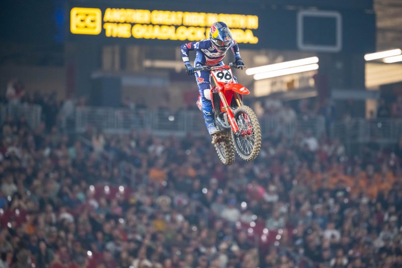 In front of a record-breaking crowd in Glendale, Arizona, for round 5 of AMA Supercross, the premier-class main event delivered high drama in the championship fight. Hunter Lawrence powered to a strong second-place finish—his fourth runner-up result in a row—and, for the first time in his 450SX career, took possession of the red plate that goes to the championship leader.