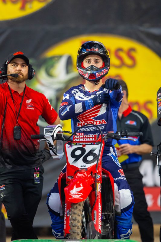 “Second again—we just focus on the positive. I just felt a little flat; usually, around the 10-minute mark, I feel like, ‘Alright, we’re on,’ but I couldn’t quite get into that tonight. I tried to make a push at the end with Kenny [Roczen] and closed a little bit on him, but a little too late. The first thing I focus on is the start, and I saw Eli [Tomac] down when I came back on the start straight; that was obviously in my favor, but I just focused ahead. Kenny had the sand line really good. The majority of the day, the outside was a better run into that double-triple; I hadn’t gone inside yet in the race, and I didn’t realize how good it actually was. Sure enough, after I got passed [by Roczen], I went inside for the rest of the race, so that’s on me. Before the beginning of the season, I had supercross circled on my calendar for this year. I’m happy to have the red plate—it’s cool in the 450 Supercross Championship. I want to keep it, but I just want the red plate at the last round, plain and simple. From 2020, the amount of work to be here, it’s kind of tough to put into words how much goes into getting to this point, but it is pretty damn cool.”